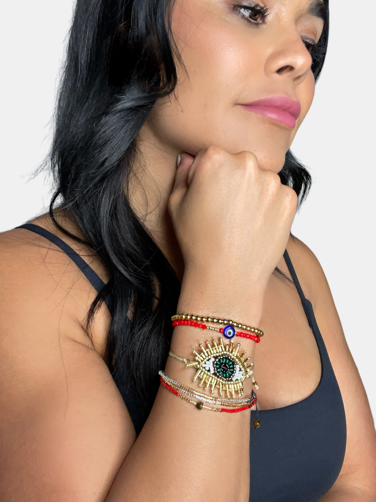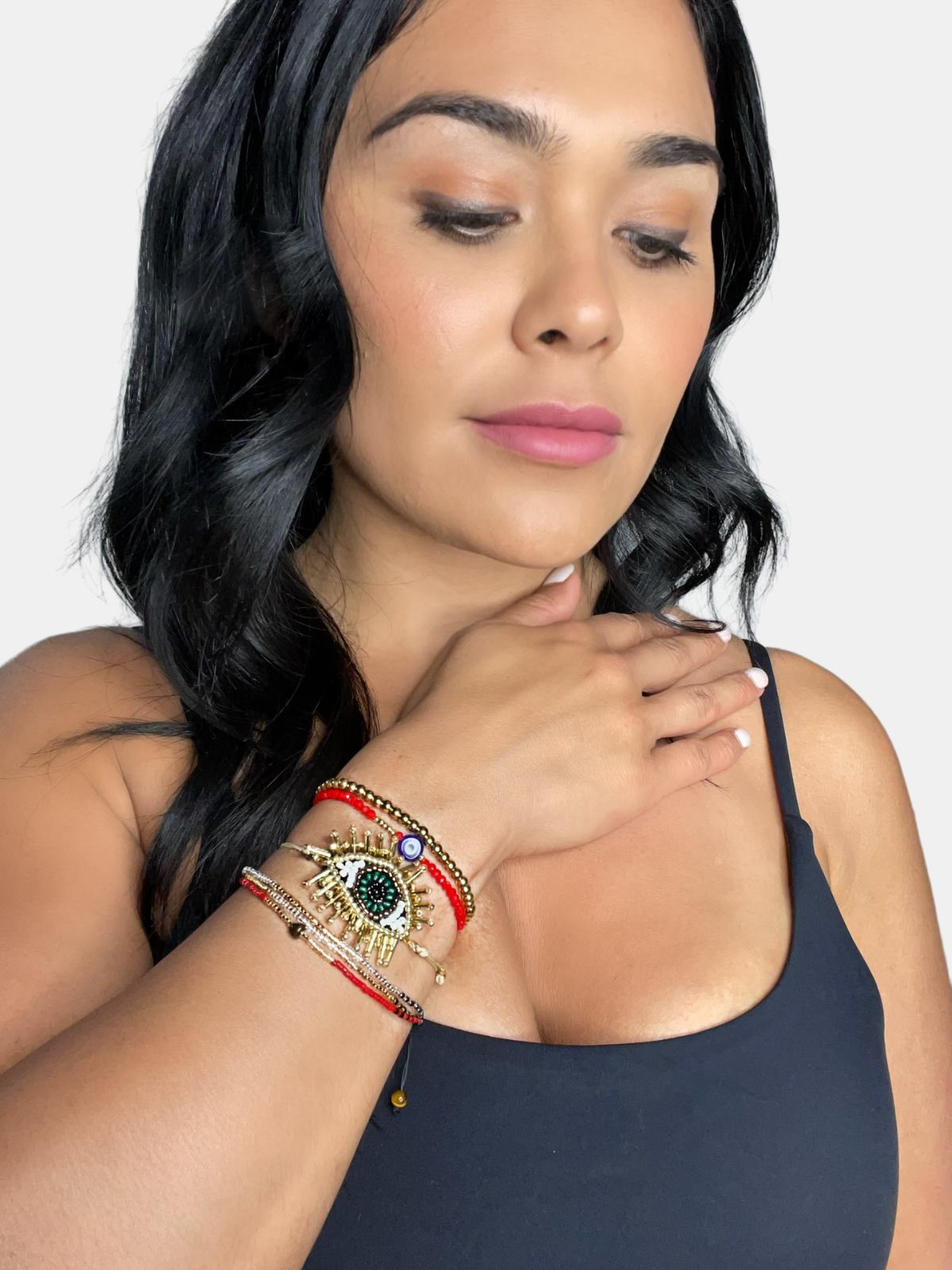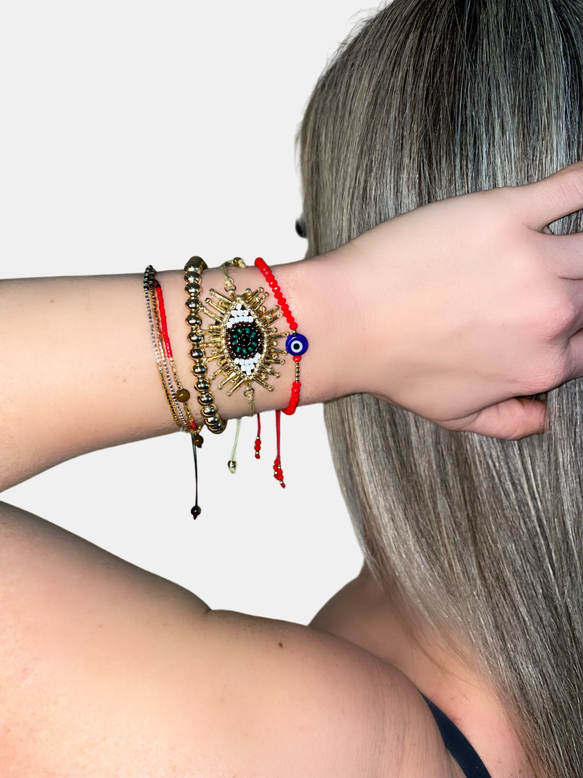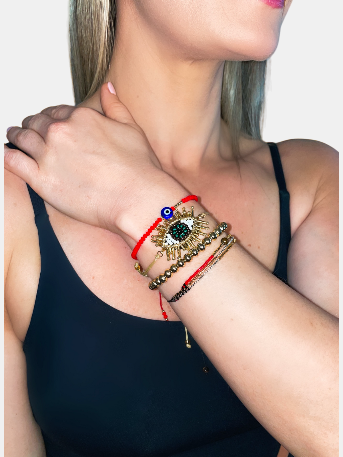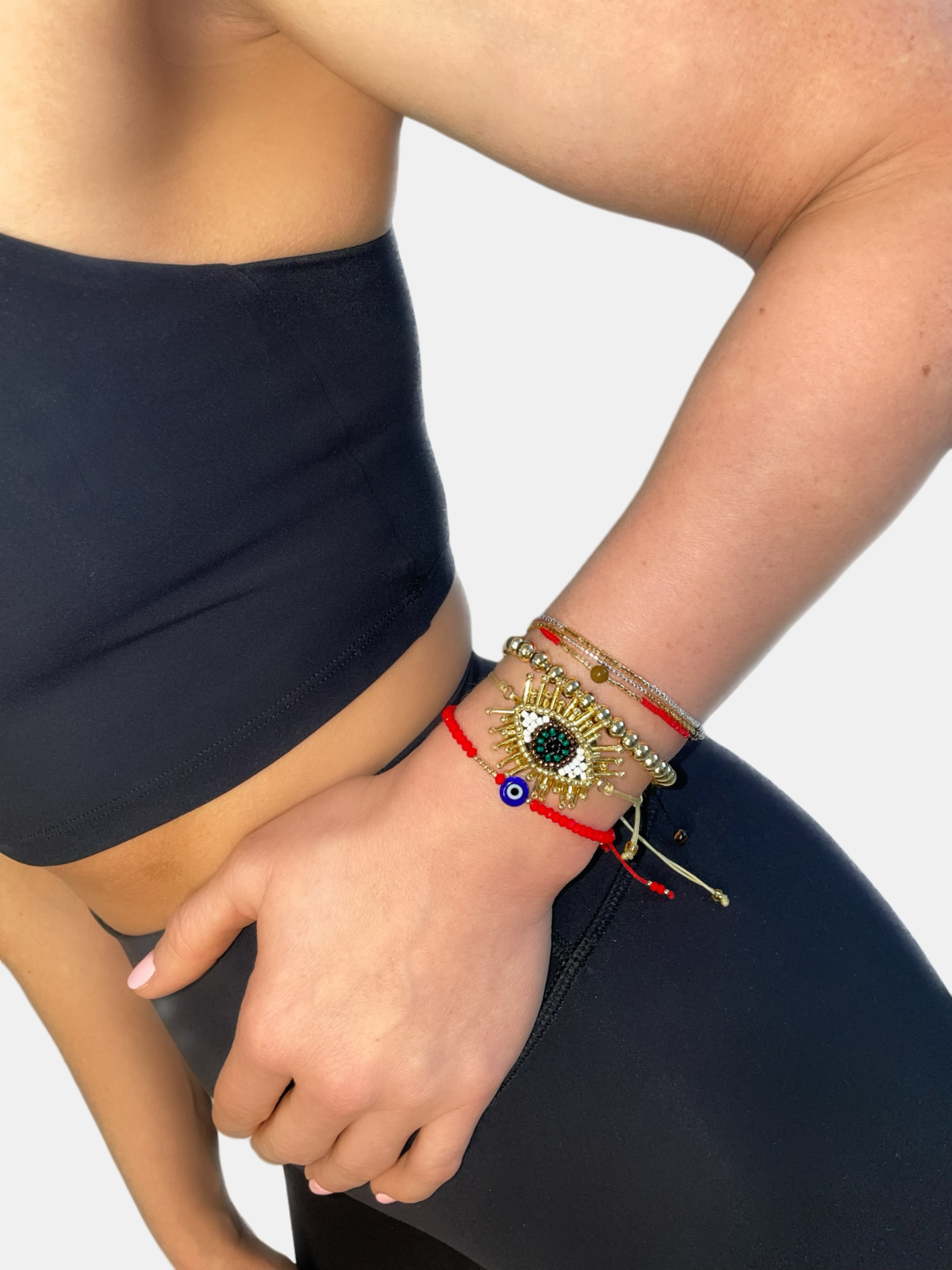 Rooted in cultural tradition, indigenous tribes adorned themselves with red bracelets, known as the "Ojo" or "evil eye" in Spanish, as a symbol of protection against negative energy. This bracelet set is inspired by fashion and steeped in cultural tradition; the Ojo is known to serve as a shield against bad energy. Crafted for durability and adjustability, each set comes with four fashionable bracelets that are both comfortable and fit both gym wear and everyday outfits.